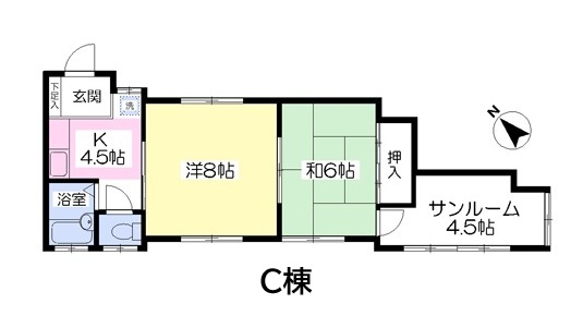 | 使用部分面積 | 208.65㎡ | 間取り | A棟1K×2戸、B棟1K×2戸、C棟2K+S×2戸 |